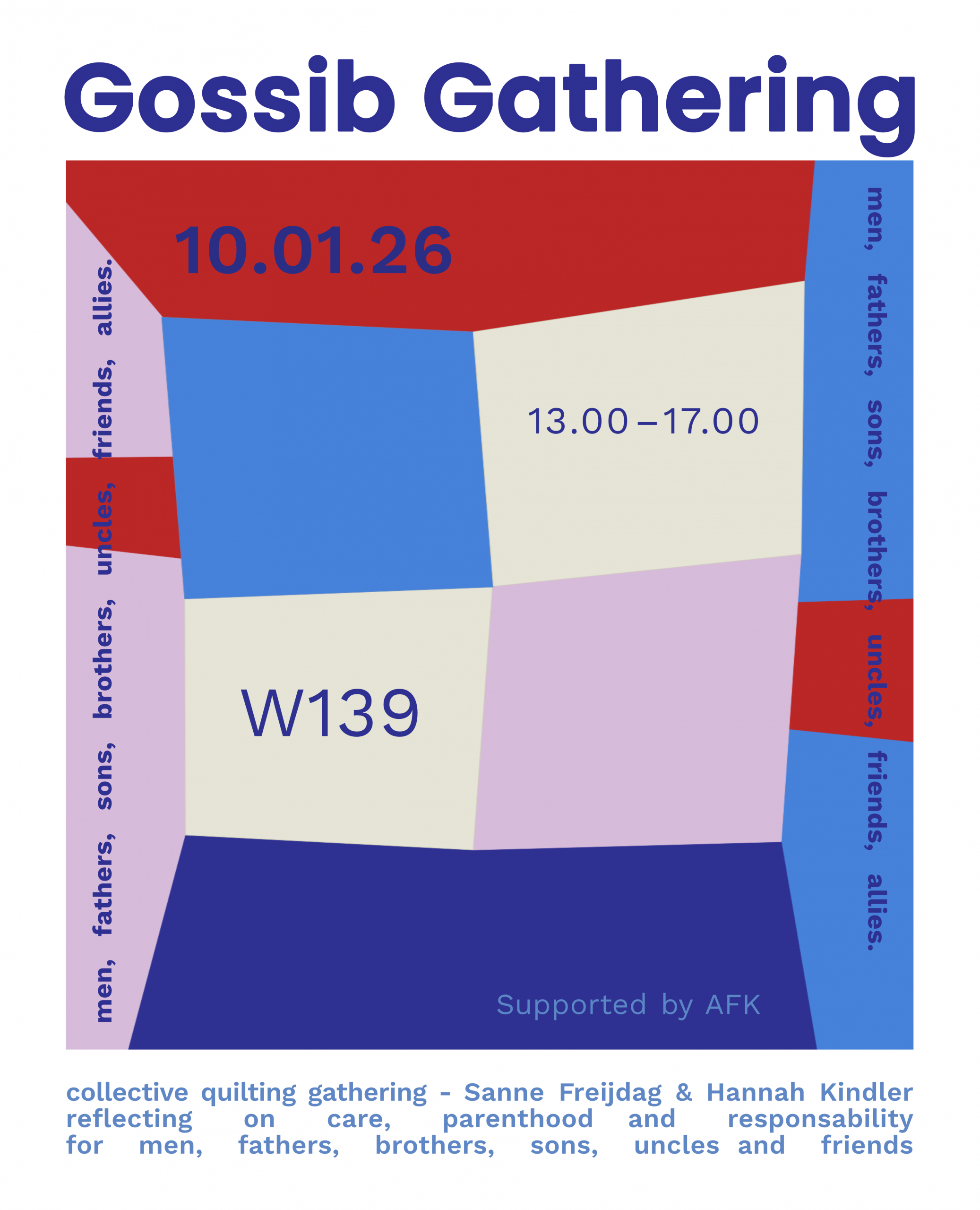 The name “Gossib” refers to the Old English Godsibb, or “relative/spiritual neighbor.” In this workshop, we reclaim the word as a role of listening, caring, and supportive alliance. This edition, in collaboration with Hannah Kindler, focuses specifically on people who do not give birth themselves and invites reflection and practice around shared care and community.