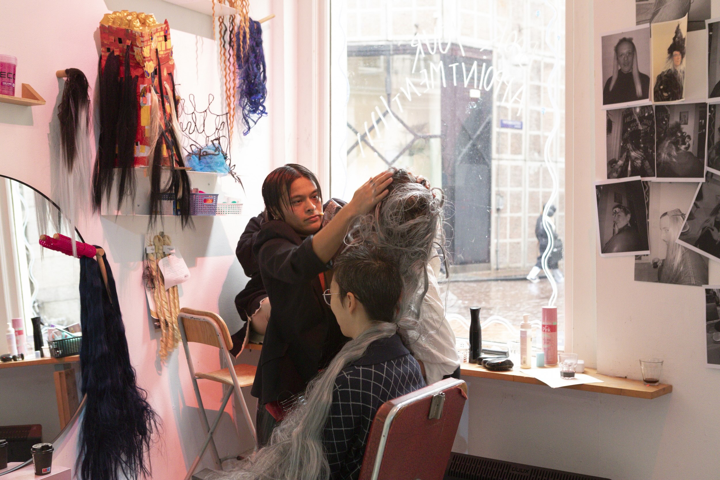 phANTASMAL HAIRSALON is a multidisciplinary art exhibition and performance choreographed by Raoni Muzho Saleh in co-creation with Karin Iturralde Nurnberg. W139 will transform into a campy, draggy hair salon where members of the public—the Clients—undergo a fabulous (or fabulously wrong) performative hair transformation by wearing a sculptural hairstyle while the rest of the public watches the performance.